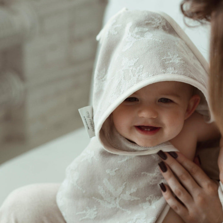・85×85cmサイズのタオルには、フードの対角に、ネックホルダーが付いており、パパママの首にかける事ができます。両手が自由になり、お風呂上がりの赤ちゃんをすぐにしっかり安全に抱きかかえる事ができます。ネックホルダーをご使用にならない際に脚や腕に引っかからないようご注意ください。