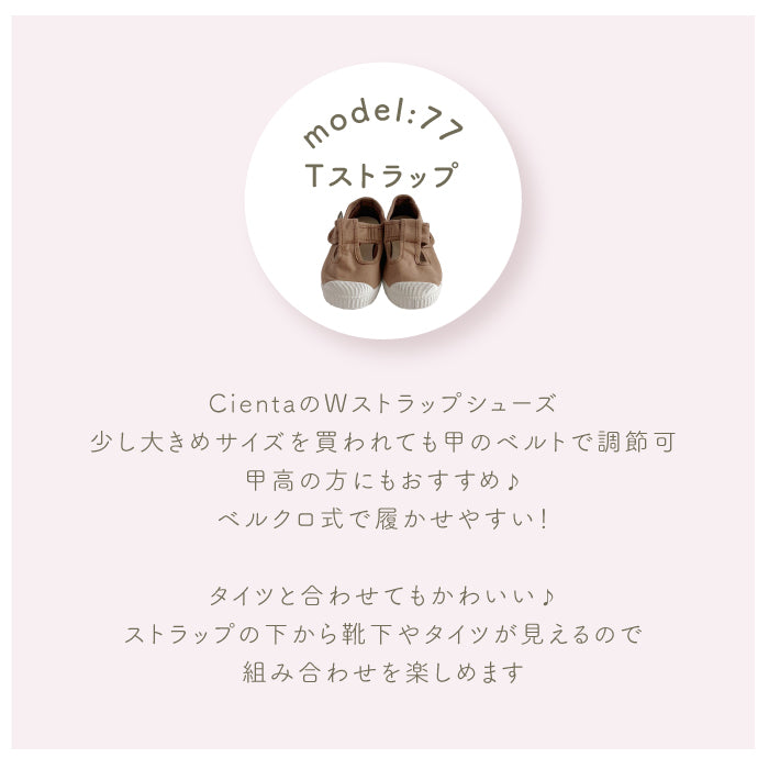 ベロア生地を使用した、Tストラップタイプの履きやすいシューズ。