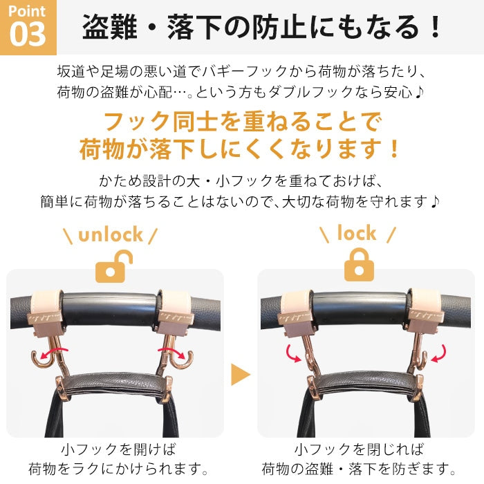 かため設計の大・小フックを重ねることで荷物が落下しにくくなるので、大切な荷物を守れます。