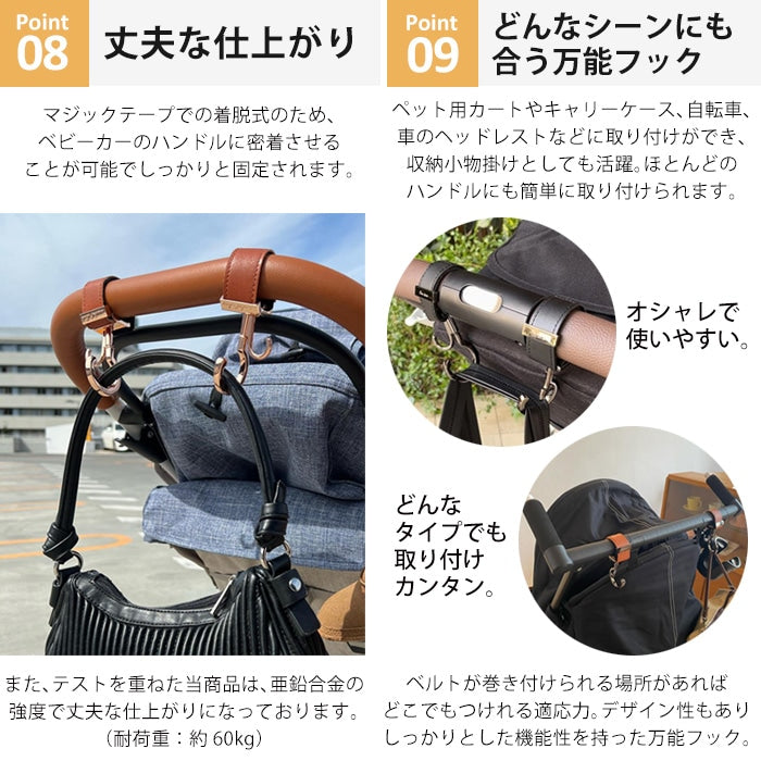 ペット用やキャリーケース、自転車、車のヘッドレストなどに取り付けができ、収納小物掛けとしても活躍。