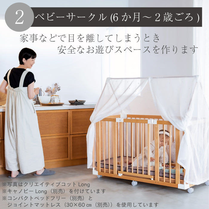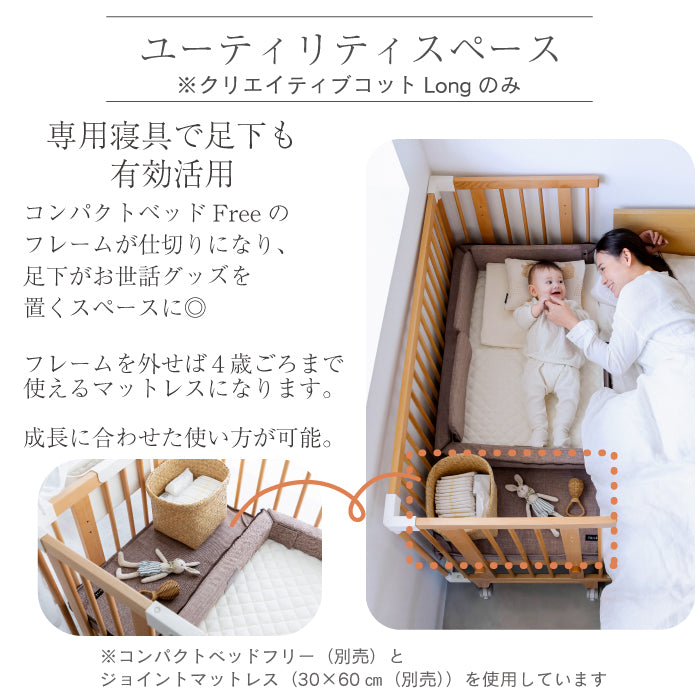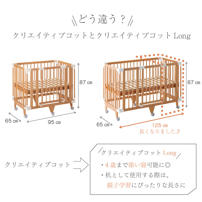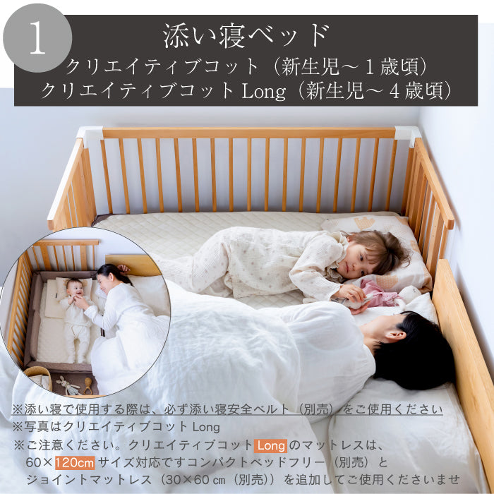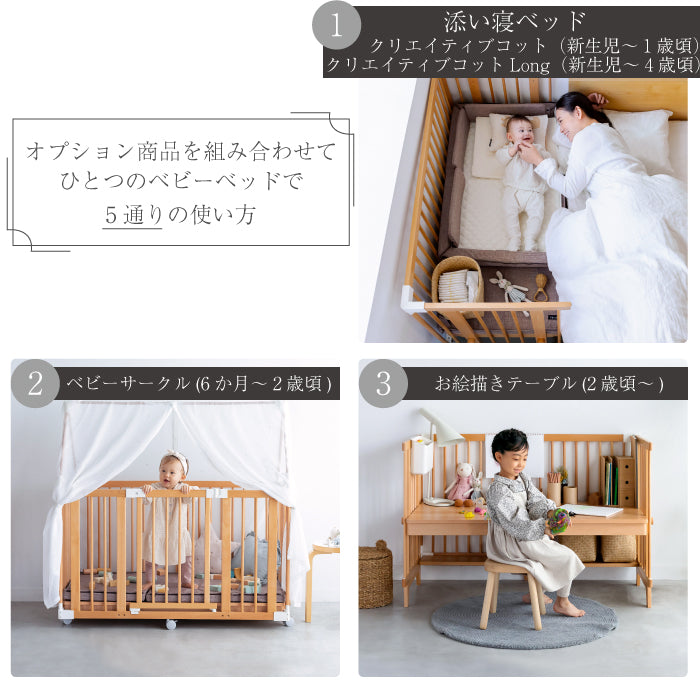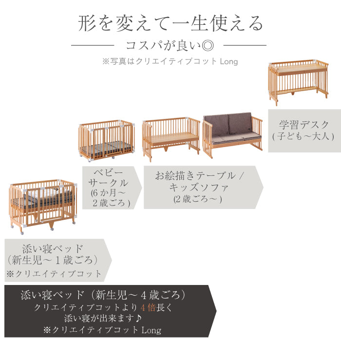 さらにクリエイティブコットLongは、4歳まで添い寝可能!親子学習ができる学習机にもなり、一生モノのベビーベッドです◎