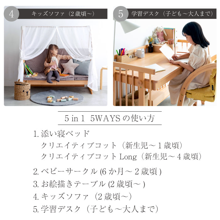 使い方は5in1(ファルスカの特許技術!)。 1.ベビーベッド 2.ベビーサークル 3.キッズソファ 4.お絵描きデスク(キッズデスク) 5.学習デスク(PCデスク) としてご利用いだたける、新生児〜大人まで生まれた日から大人になるまで 子供と一緒に成長していく新しいベビーベッドです。