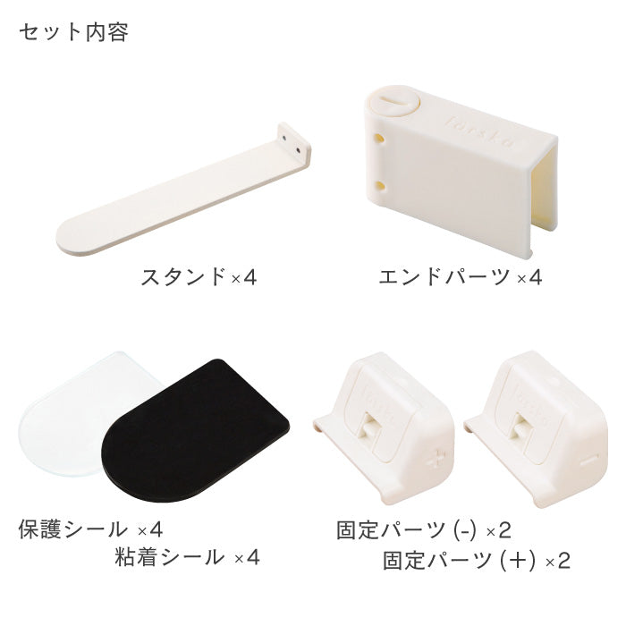 スタンド(スチール)、固定パーツ(ABS)、エンドパーツ(PP)、保護シール(基材/シリコン、粘着部/合成樹脂)、粘着シール(PU)