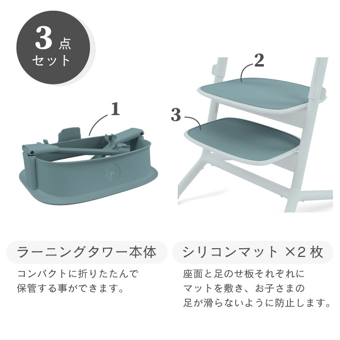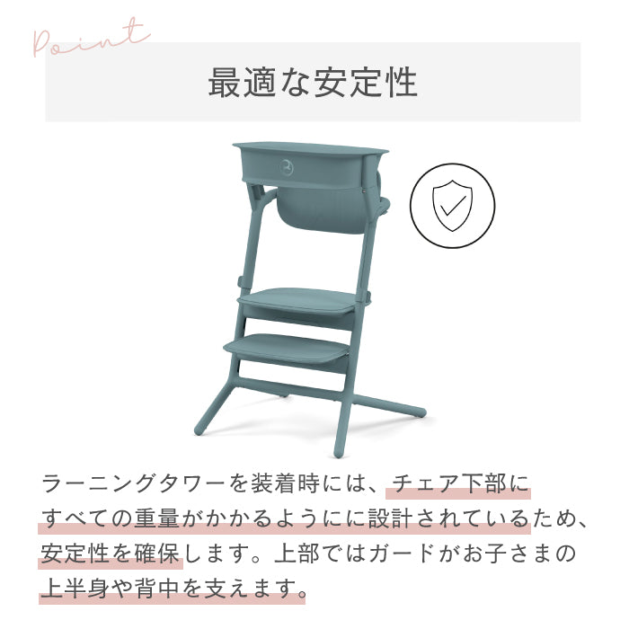 ラーニングタワーを装着時には、チェア下部にすべての重量がかかるようにに設計されているため、安定性を確保します。上部ではガードがお子さまの上半身や背中を支えます。