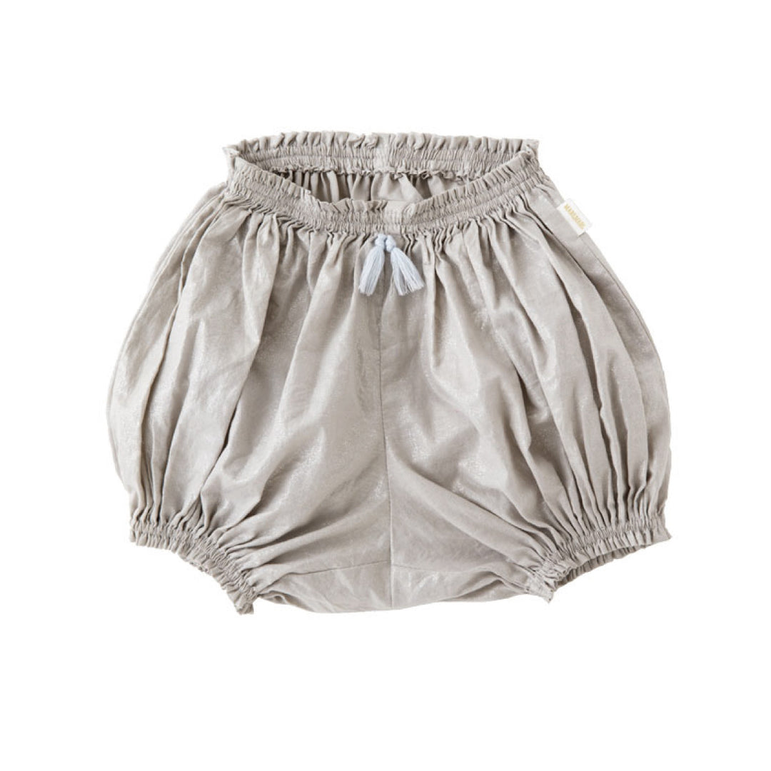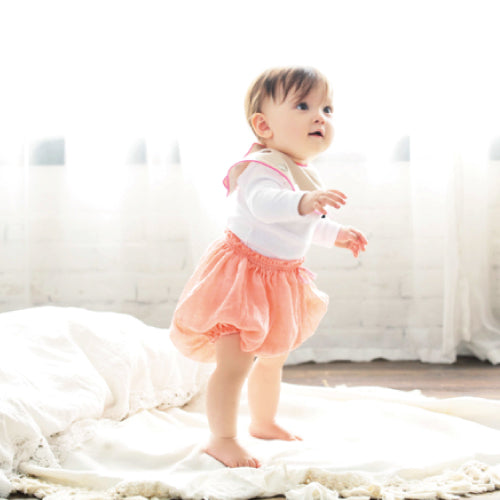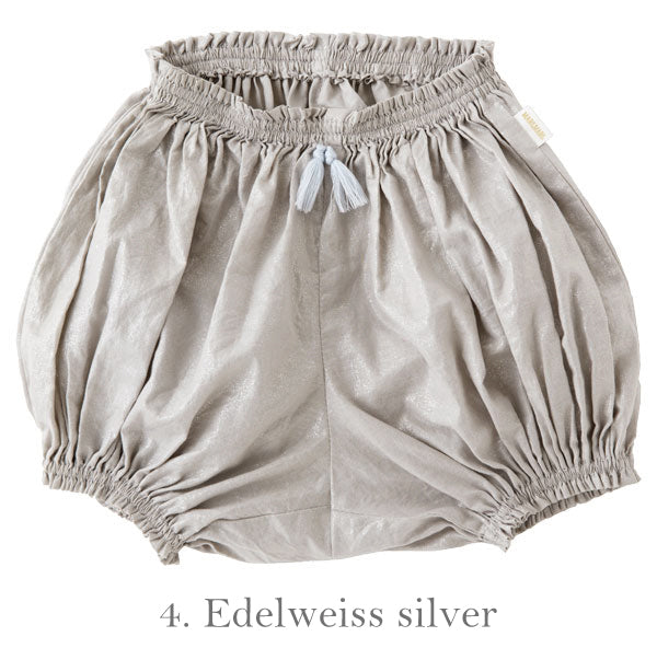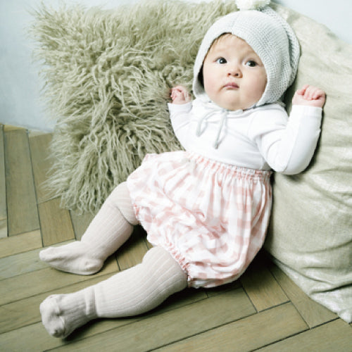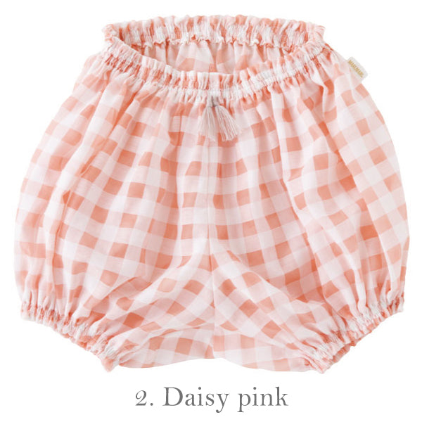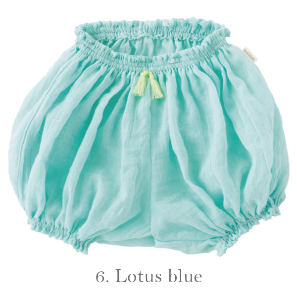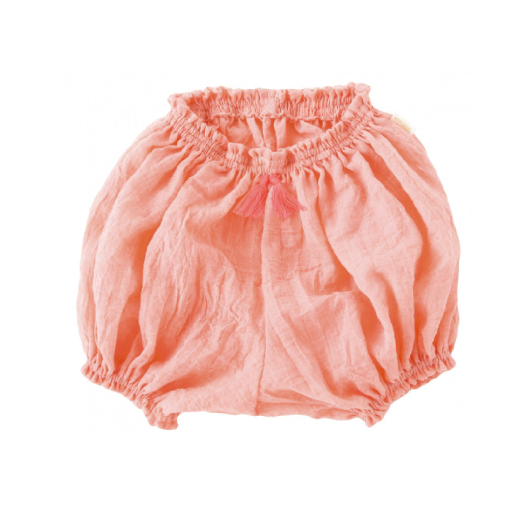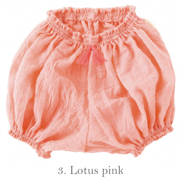 肌なじみのよいピンクはどんな服装にも合わせやすく、マールマールのスタイとも相性抜群。足口にもゴム入りで、愛らしいボリュームシルエットが完成します。動くたび揺れる、ウエストのフリンジもポイントに。