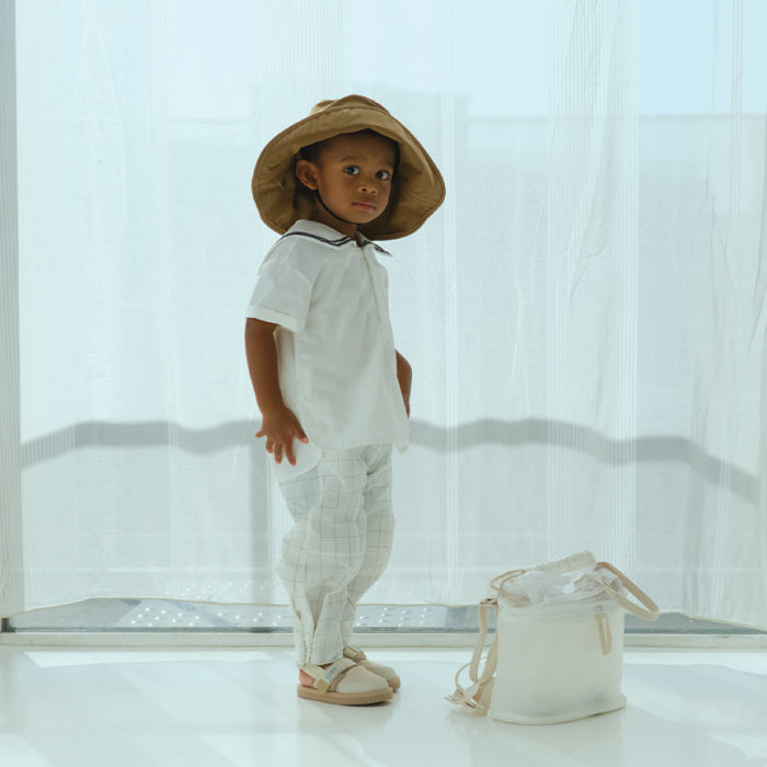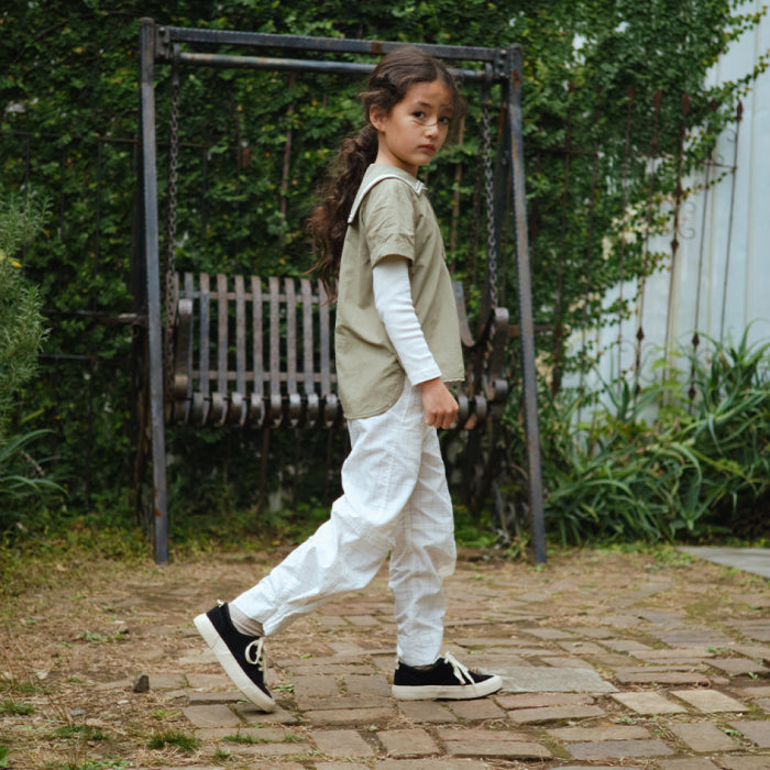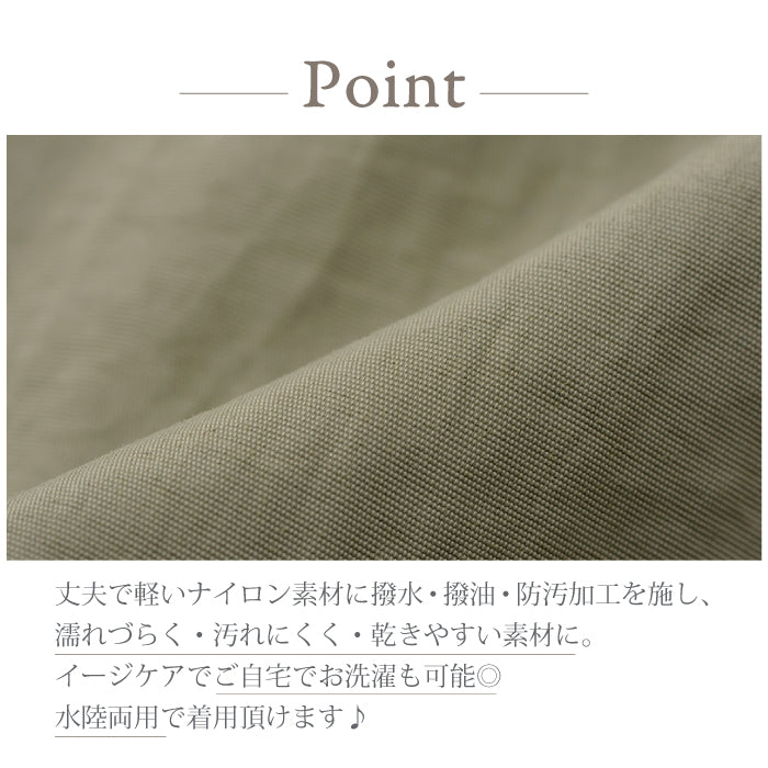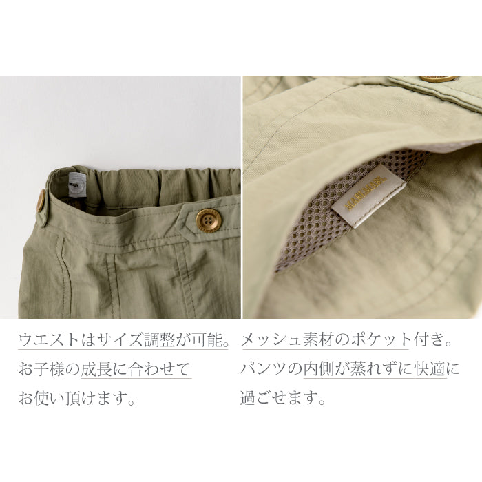 素材はタフなナイロン素材に撥水・撥油・防汚加工を施し、濡れづらく・汚れにくく・乾きやすい生地を使用しています。品の良さと機能性を兼ね備えた、夏のお外遊びにはかかせないスラックスです。