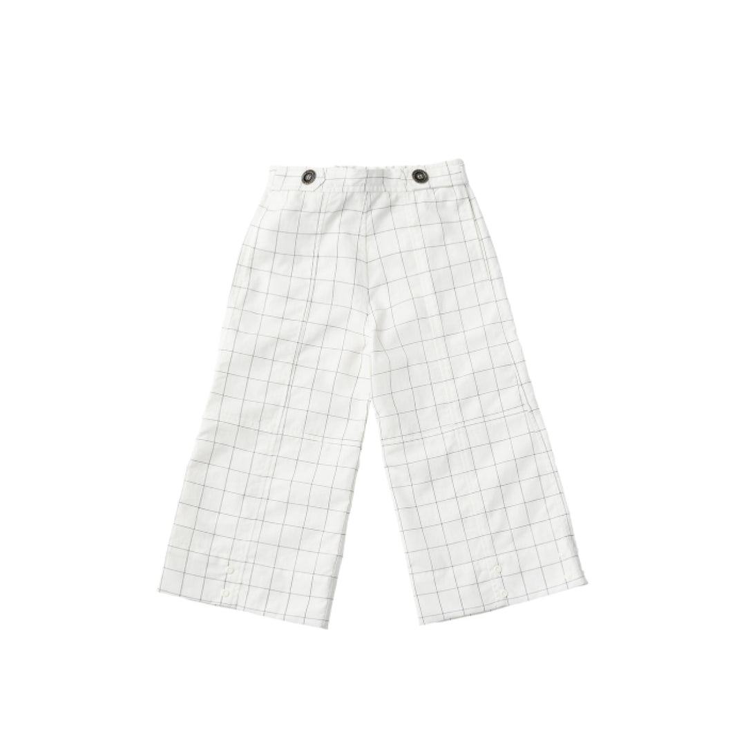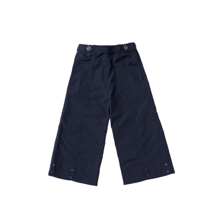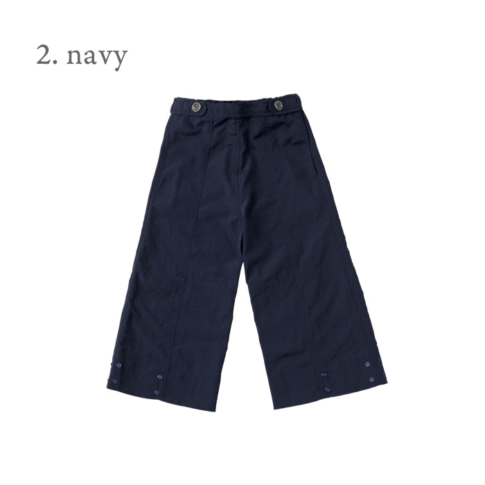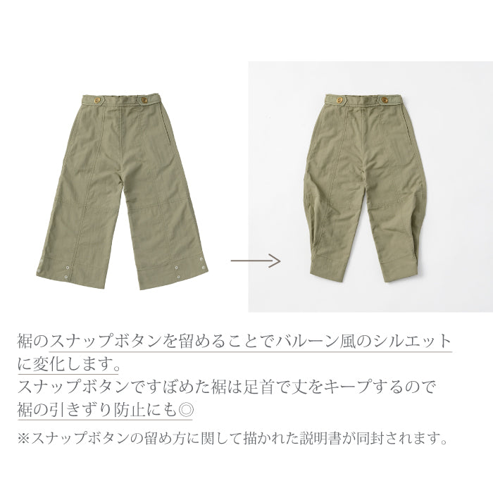 裾に並んだスナップボタンを留めることでバルーン風のシルエットに変化します。スナップボタンですぼめた裾は足首で丈をキープするので、裾の引きずり防止にも。