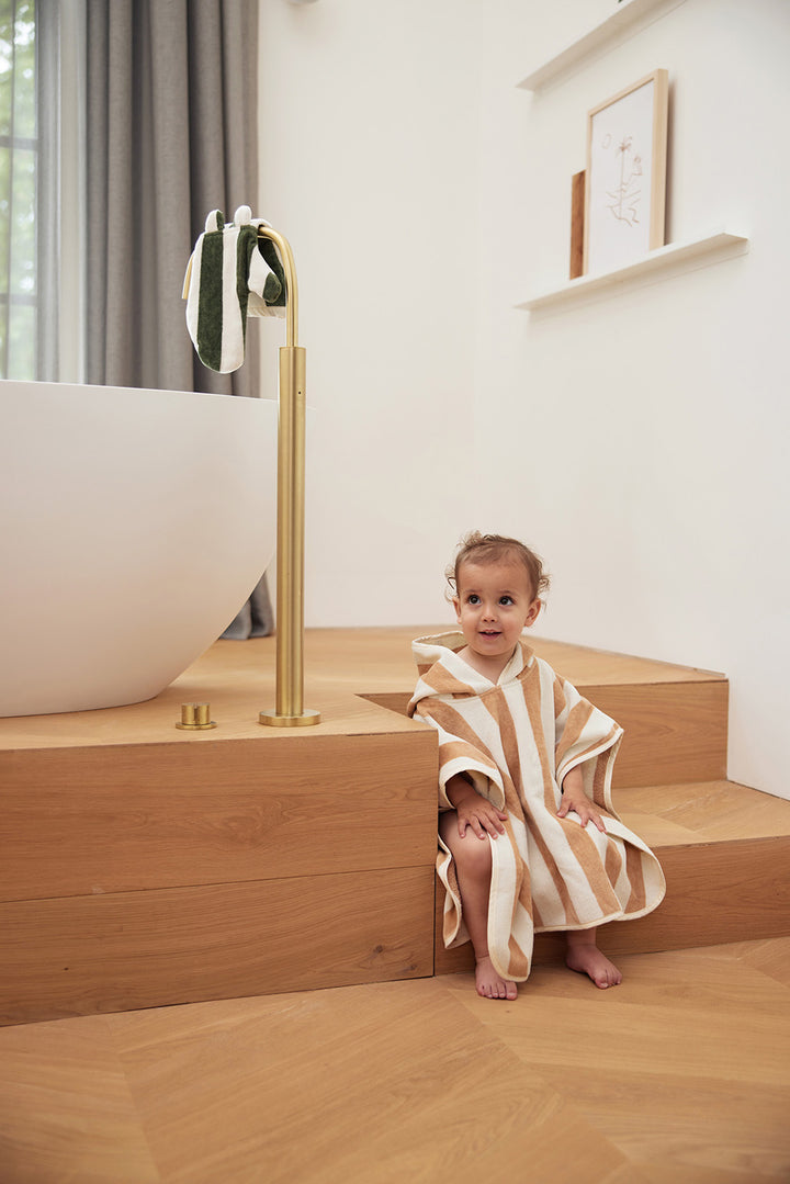 ナチュラルなカラーとストライプ柄が可愛い、フード付きバスポンチョ。