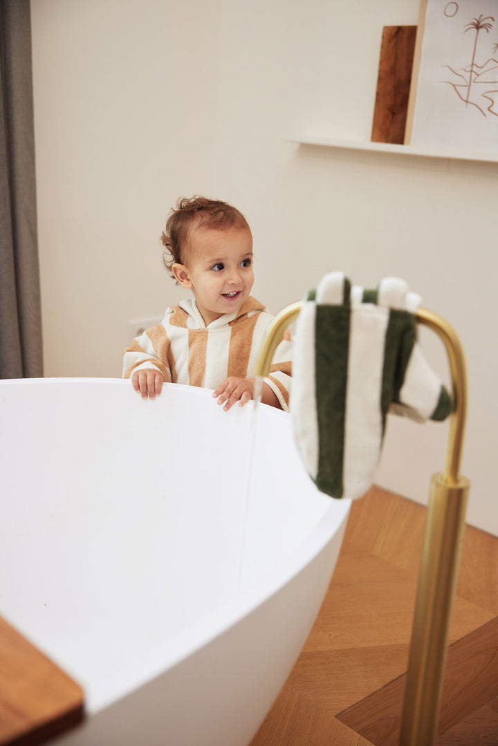 100% オーガニックコットン (GOTS) とベルベットで作られたこの上質なテリー織のバスポンチョは柔らかく吸水性も抜群。入浴・シャワー・プールの後にお子様を暖かく包み込みます。