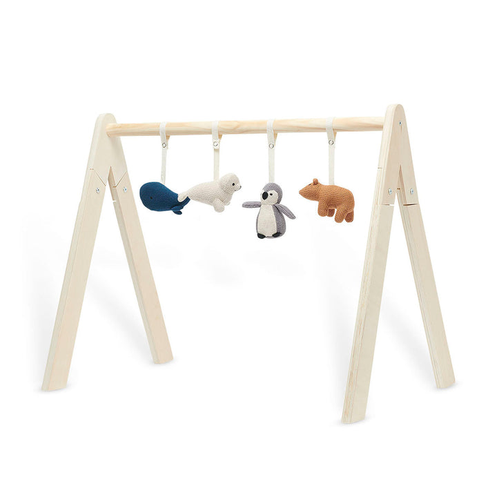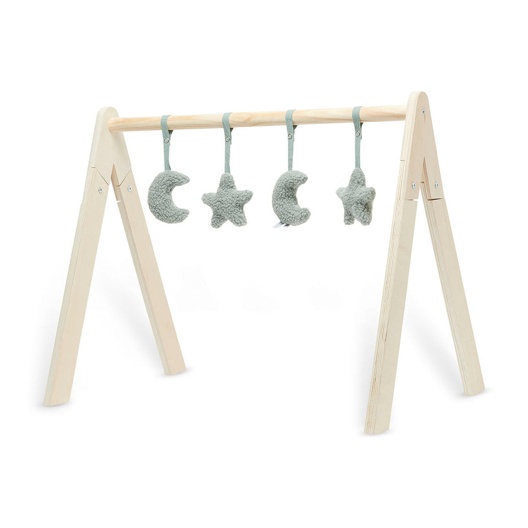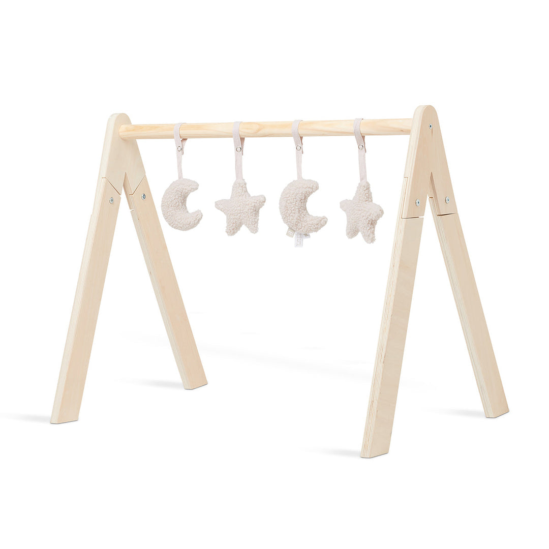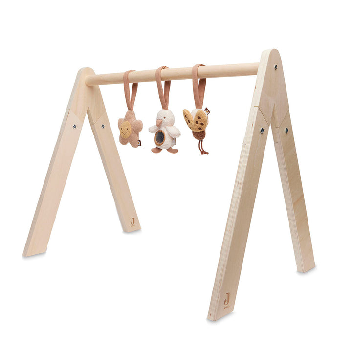 このおもちゃは、ベビージムに取り付ける事ができます。Jolleinの木製ベビージムは別売りで、組み立ても簡単です。