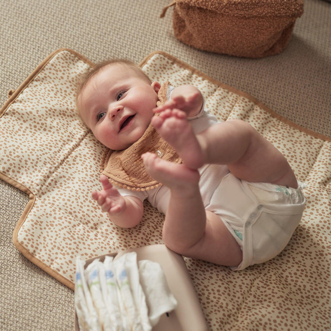 モコモコとした肌触りや見た目からフェミニンで暖かな印象を感じさせるブークレ生地を使用したチェンジングマット。柔らかく抱きしめたくなるその素材はトレンドアイテムです。
