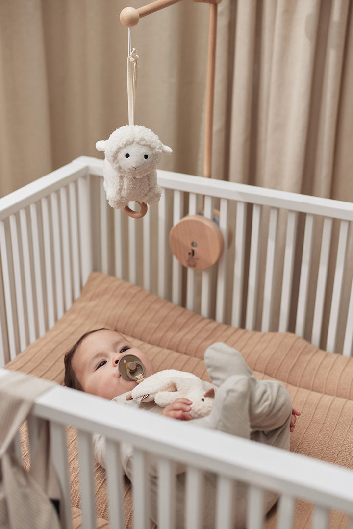 ふわふわで抱きしめたくなる羊の形をしたベッドメリーです。