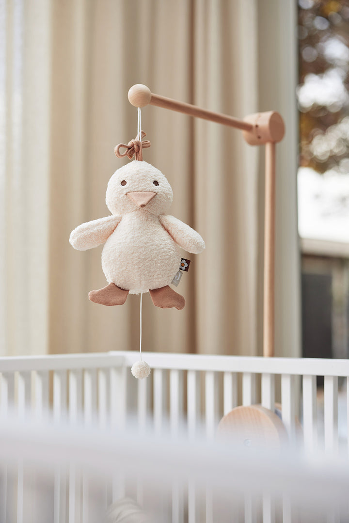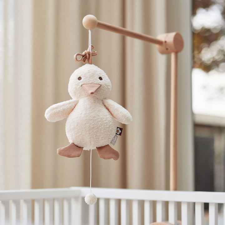 ふわふわで抱きしめたくなるお花やアヒルの形をしたベッドメリーです。
