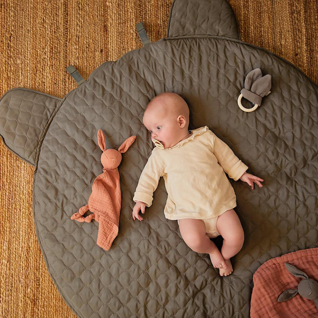 柔らかい生地で作られており、お子様が寄り添って抱きしめることができるかわいいうさぎの耳が付いています。