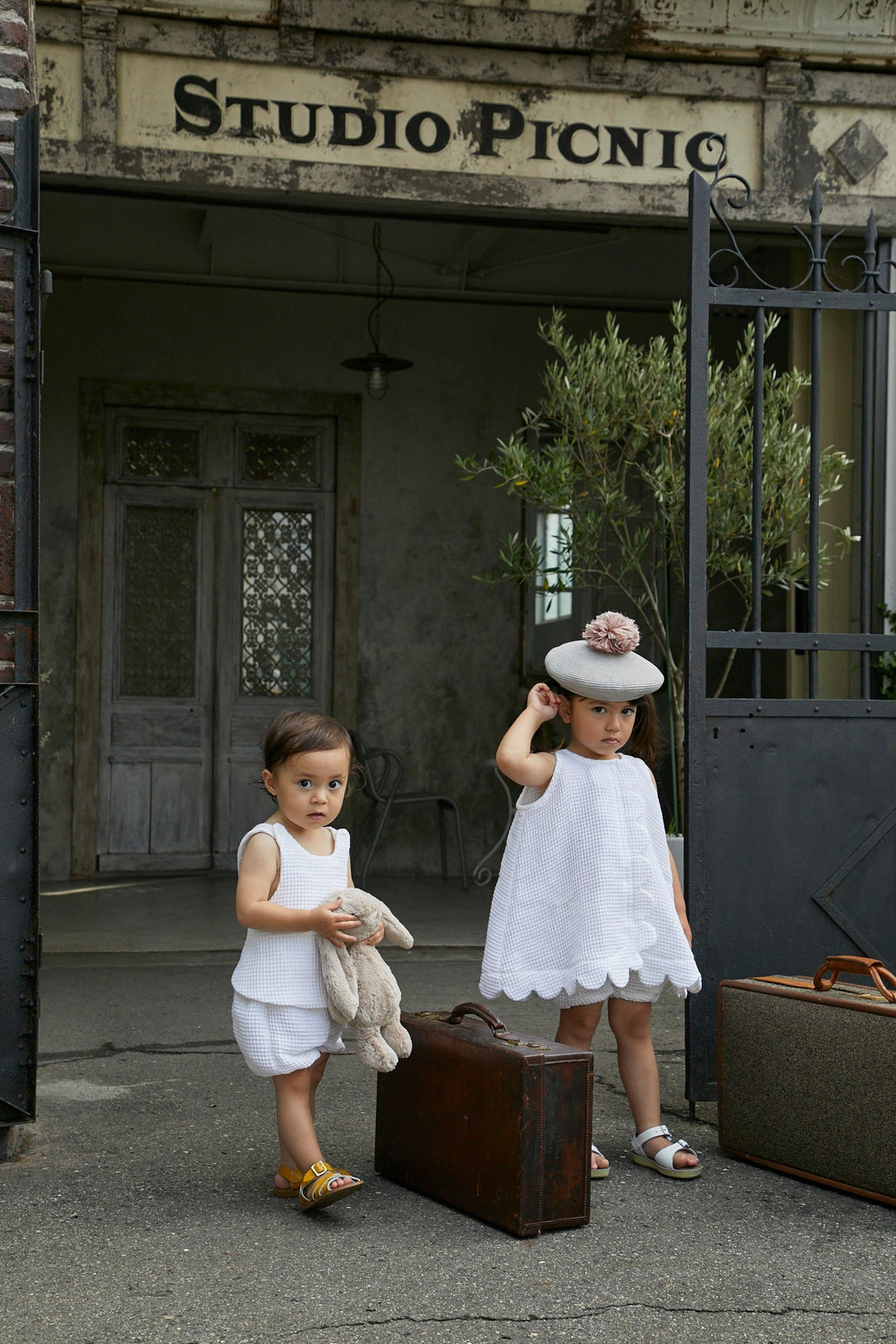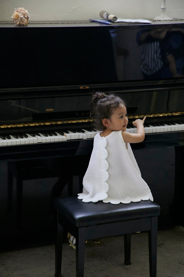 プレミアムワッフルの軽さを生かしたふんわりシンプルなフォルムに、個性が際立つスカラップフリル。動くたびふわりと揺れるワンピースは女の子はもちろん、女の子だったママにとっても特別。